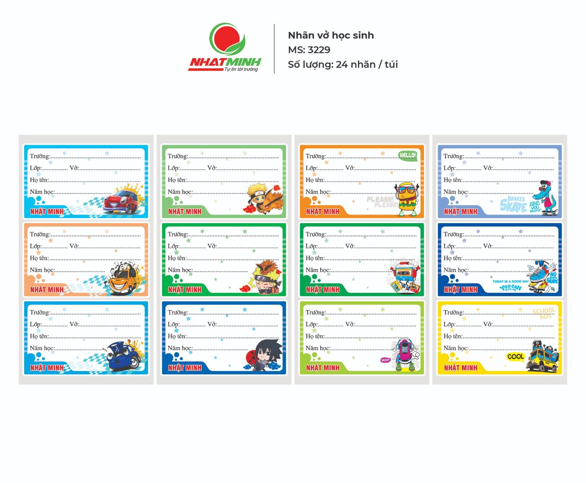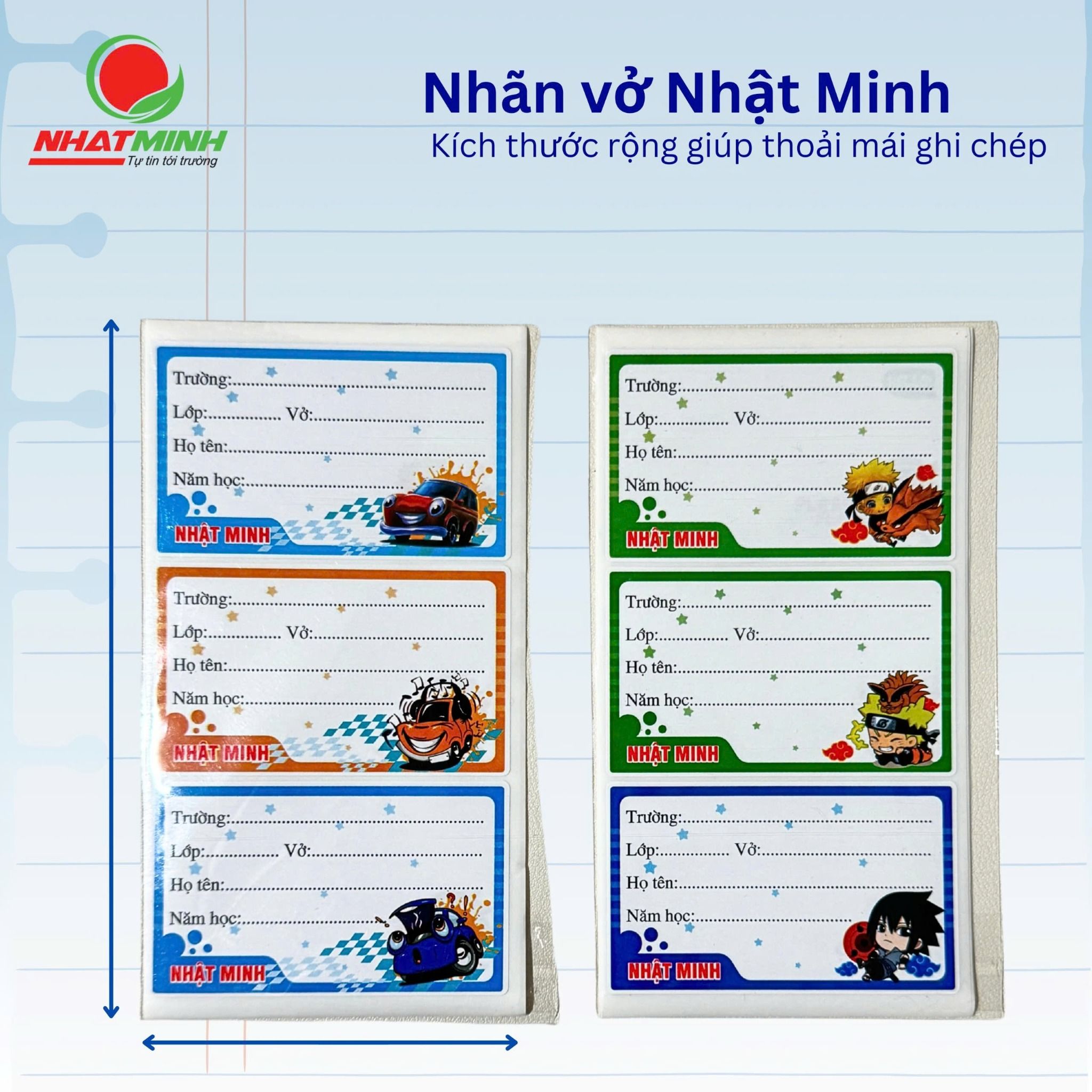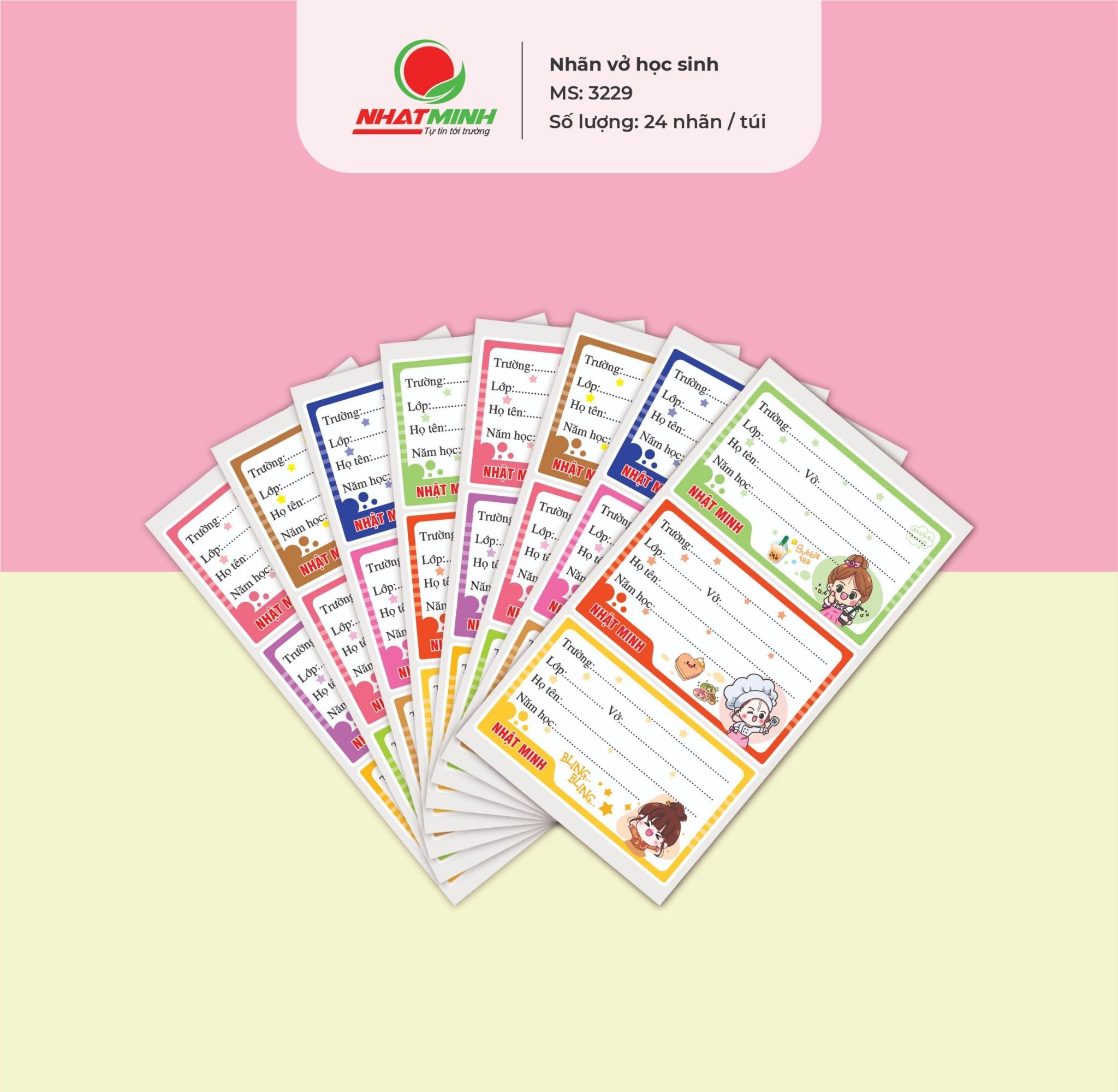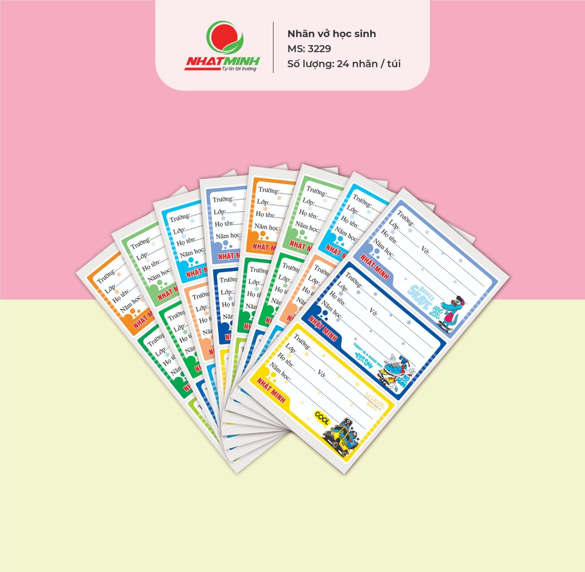 Nhãn vở Nhật Minh -  Mã SP: 3229 có phong cách thiết kế ngộ nghĩnh với hình ảnh ngộ nghĩnh, đáng yêu thích hợp cho học sinh tiểu học, trung học cơ sở. Sản phẩm được sản xuất từ giấy Decal chất lượng cao dễ dàng sử dụng